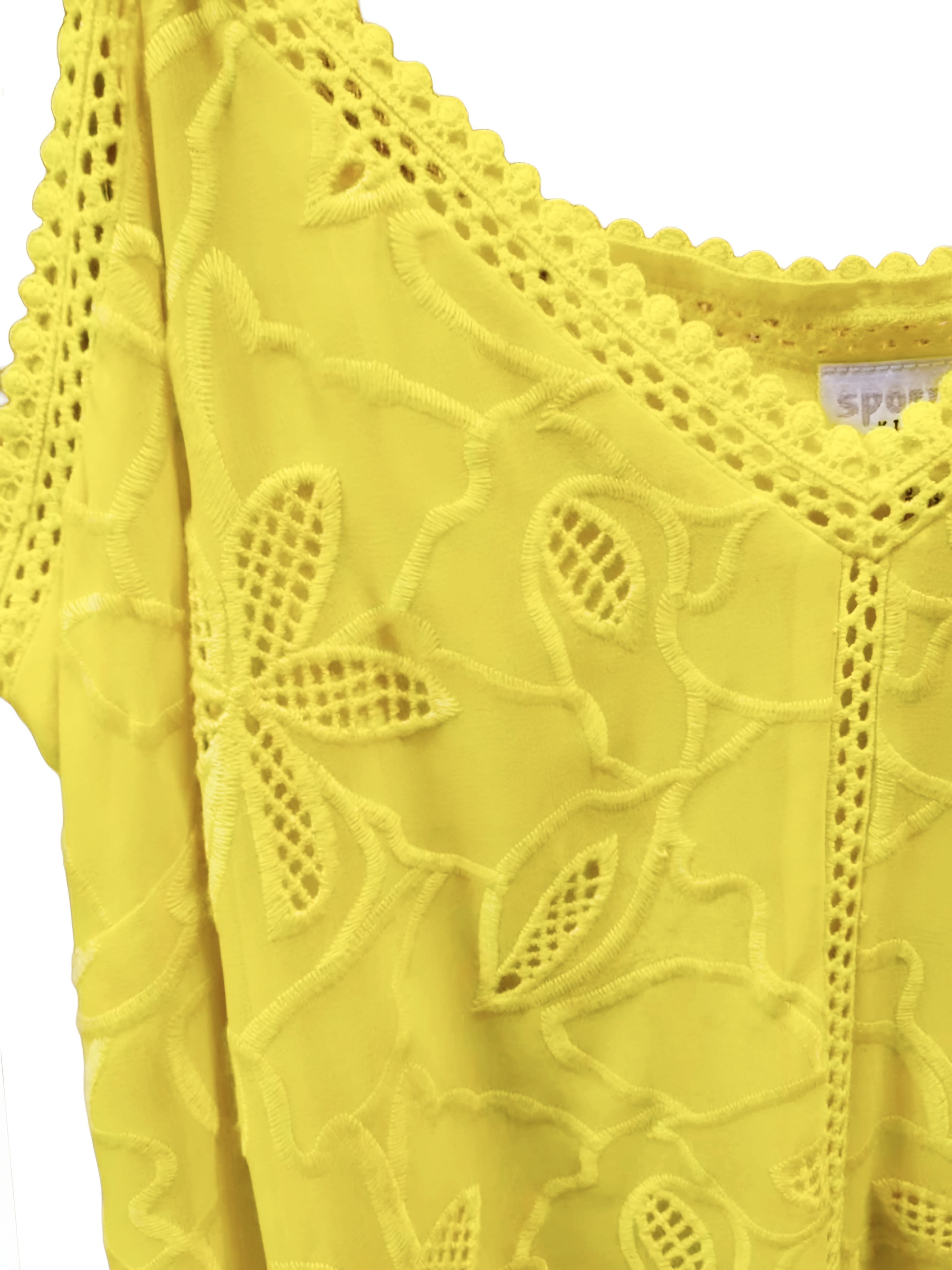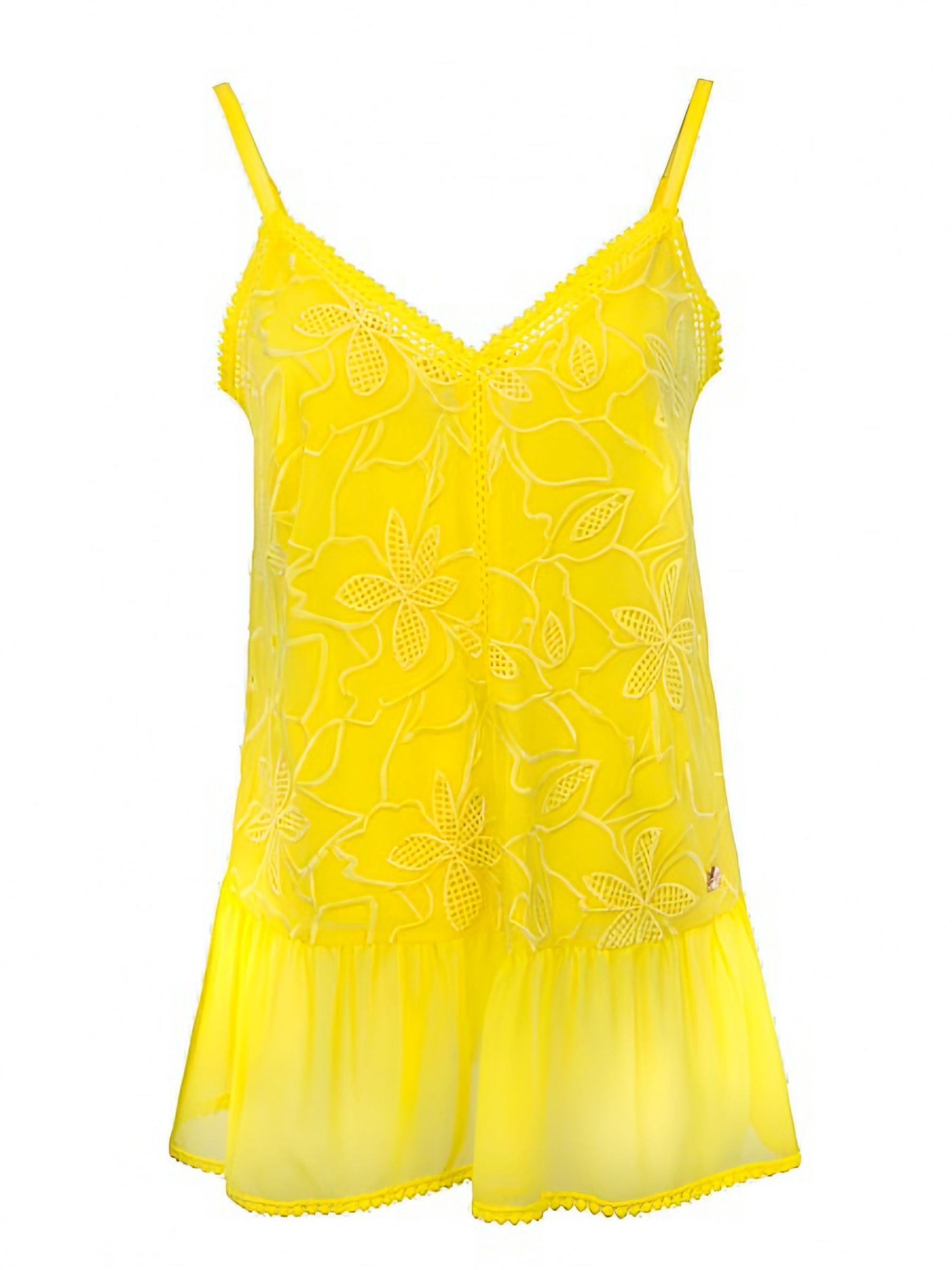 Топ спереди отделан кружевом, цветочной вышивкой и дополнен подкладкой.