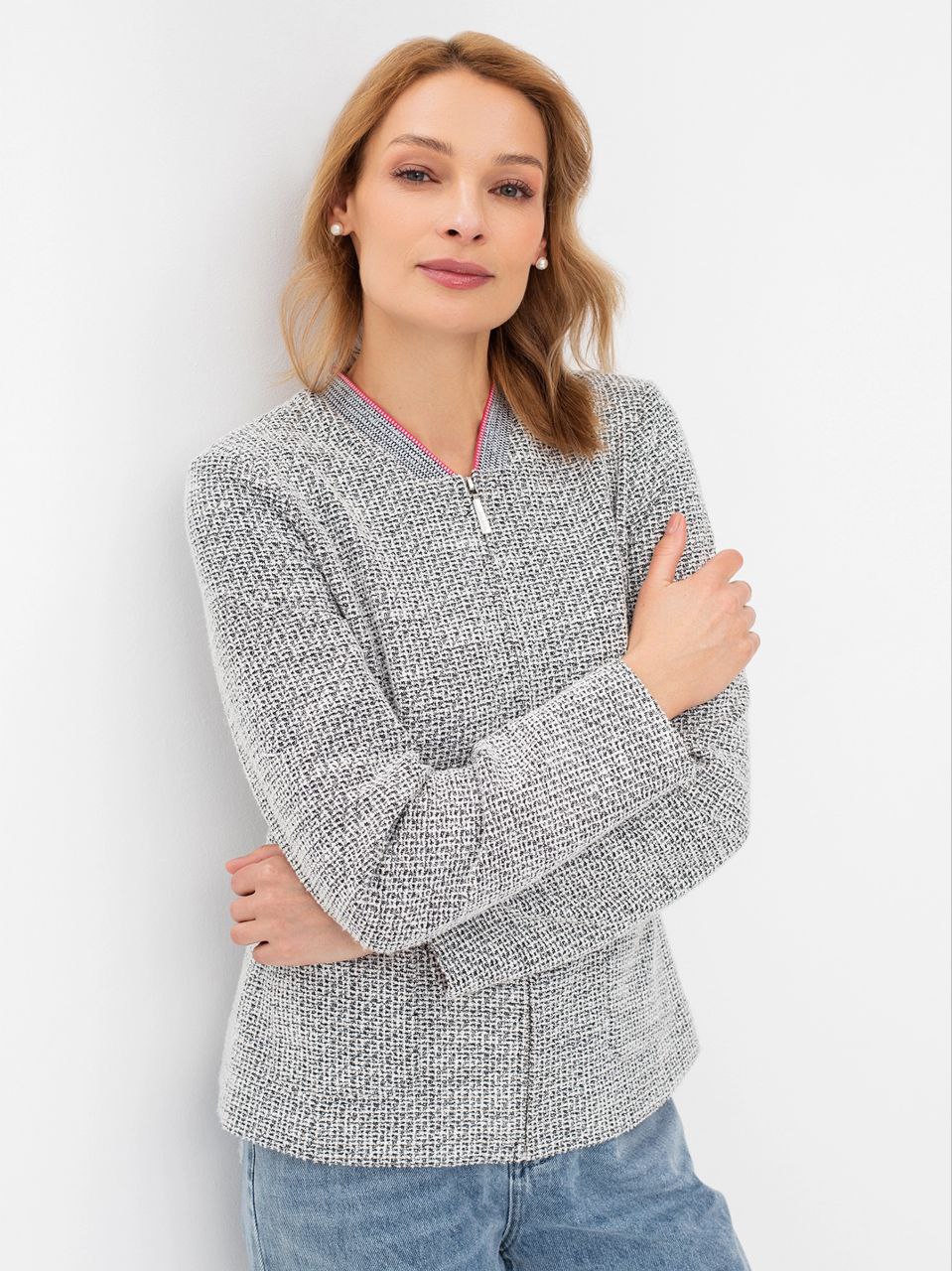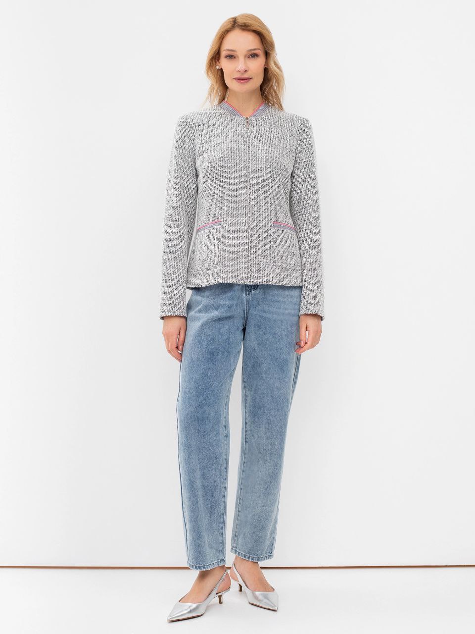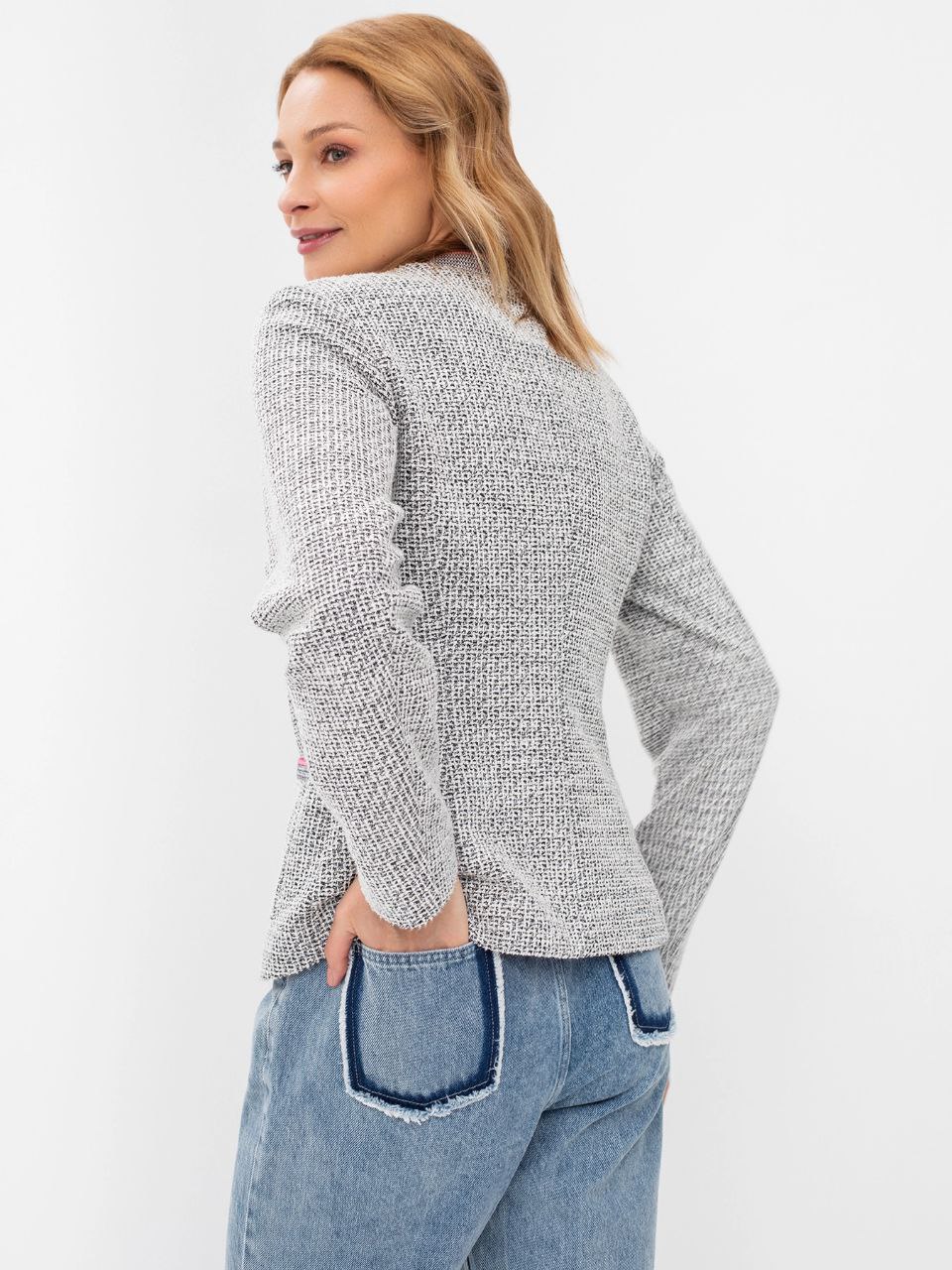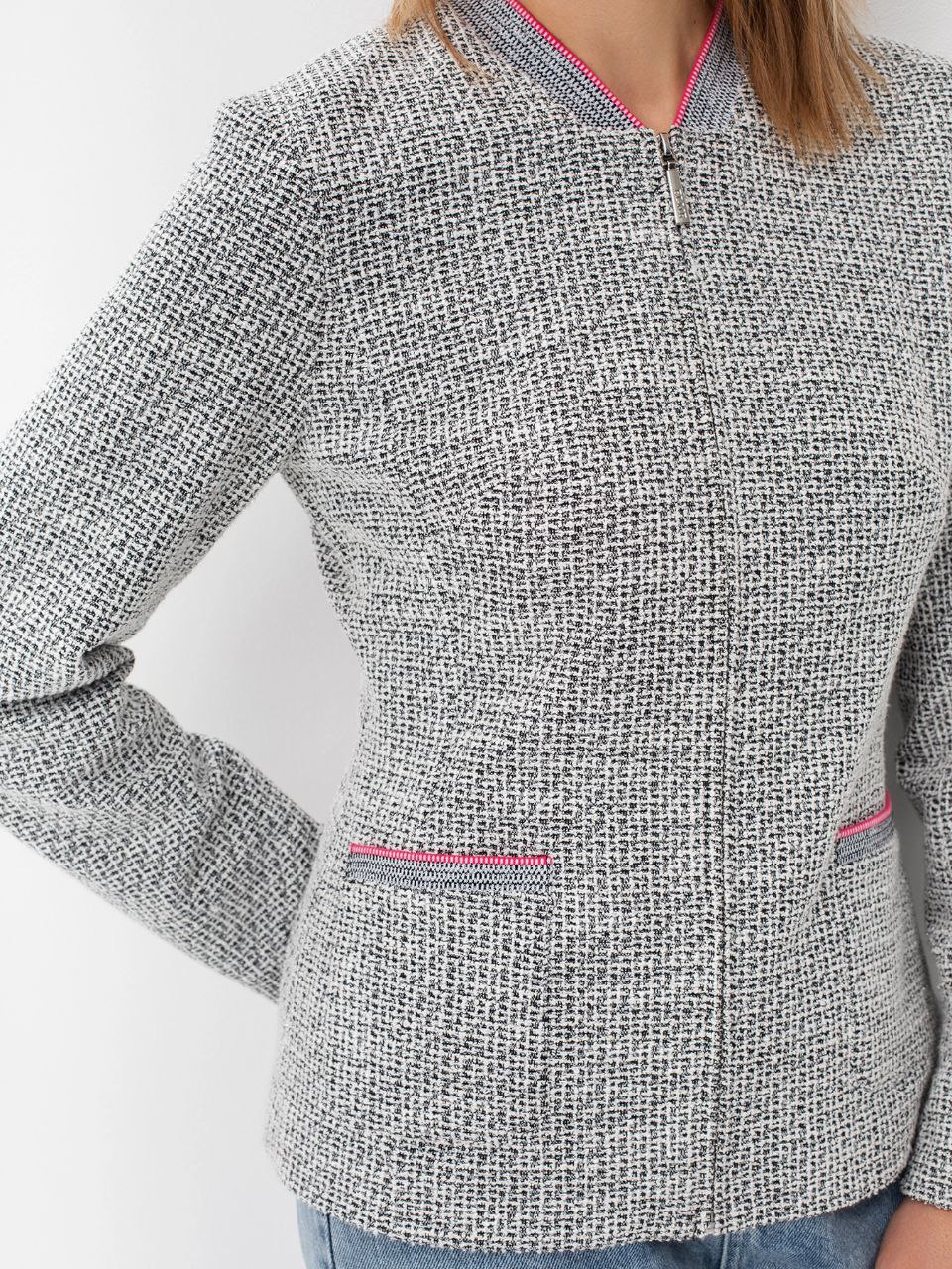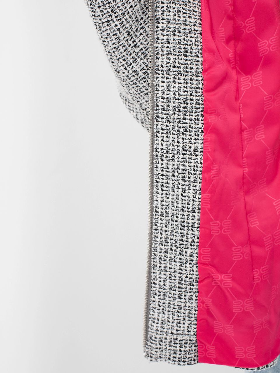 Твидовый жакет с яркой подкладкой.