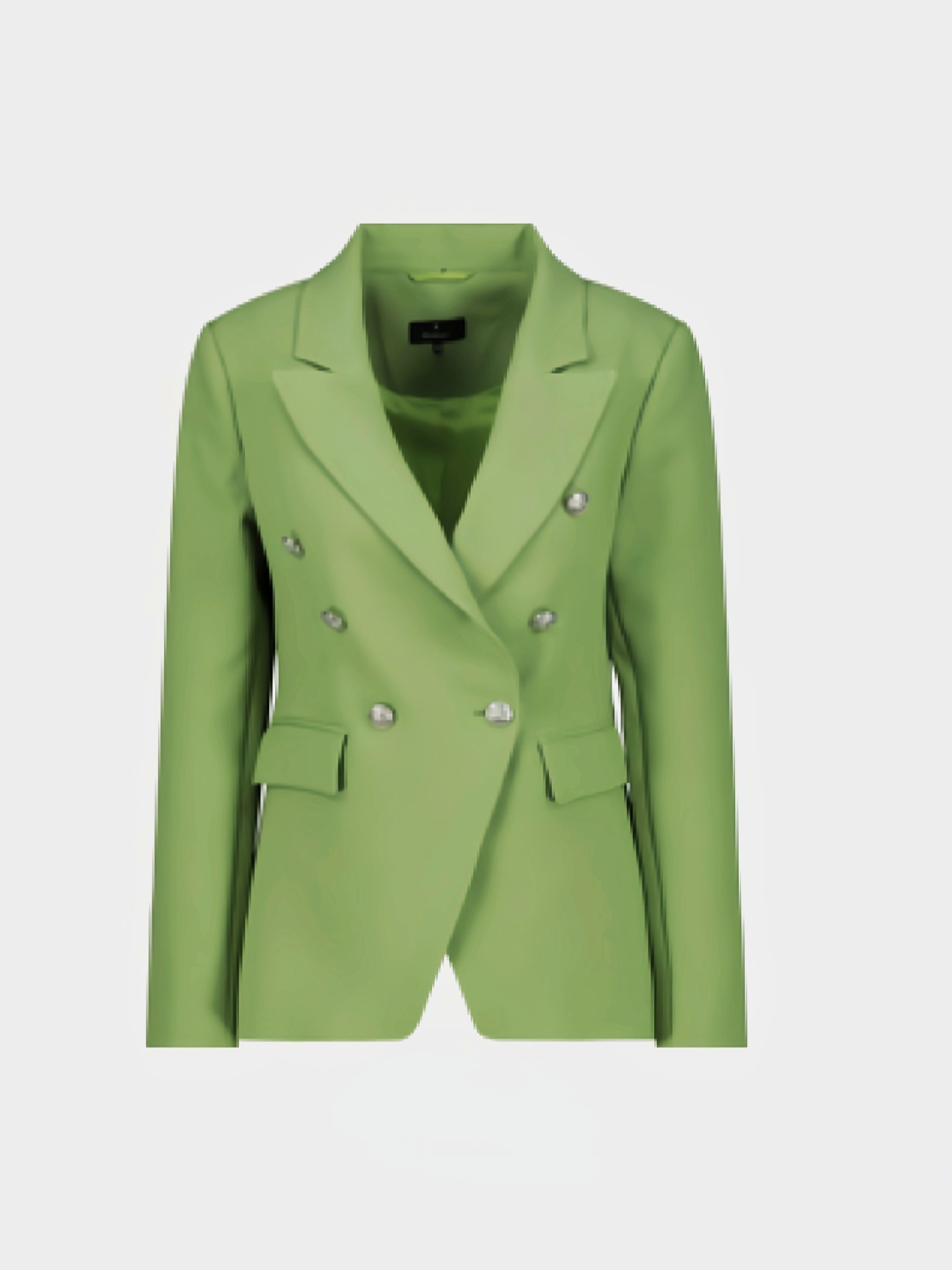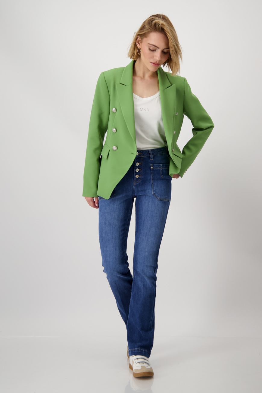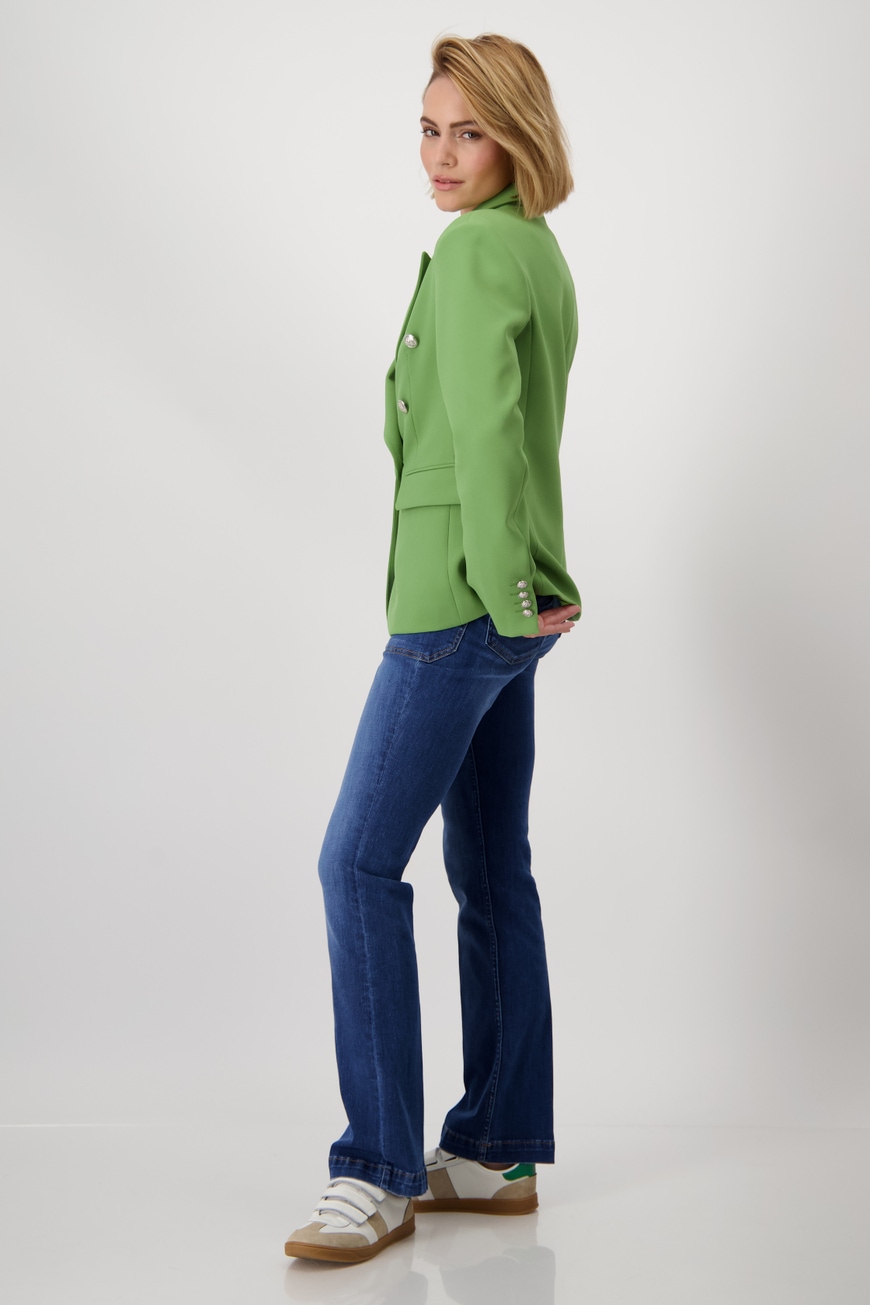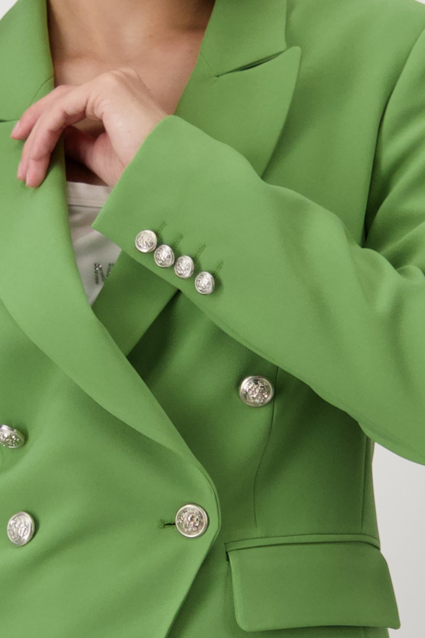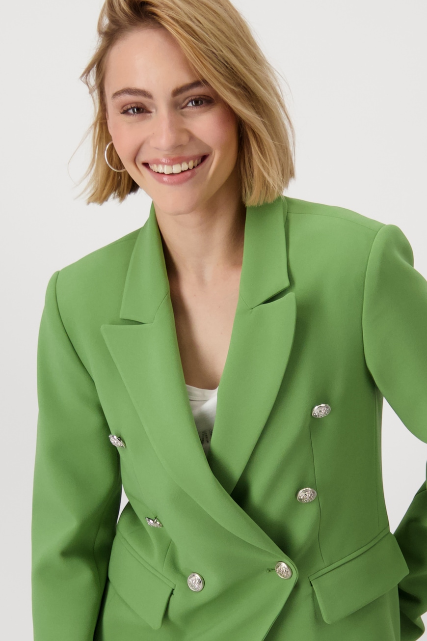 Жакет двубортный женский с воротником-лацканом из коллекции весна-лето 2025 немецкого бренда Monari отличается элегантным внешним видом и двубортной планкой на пуговицах с декоративными пуговицами.