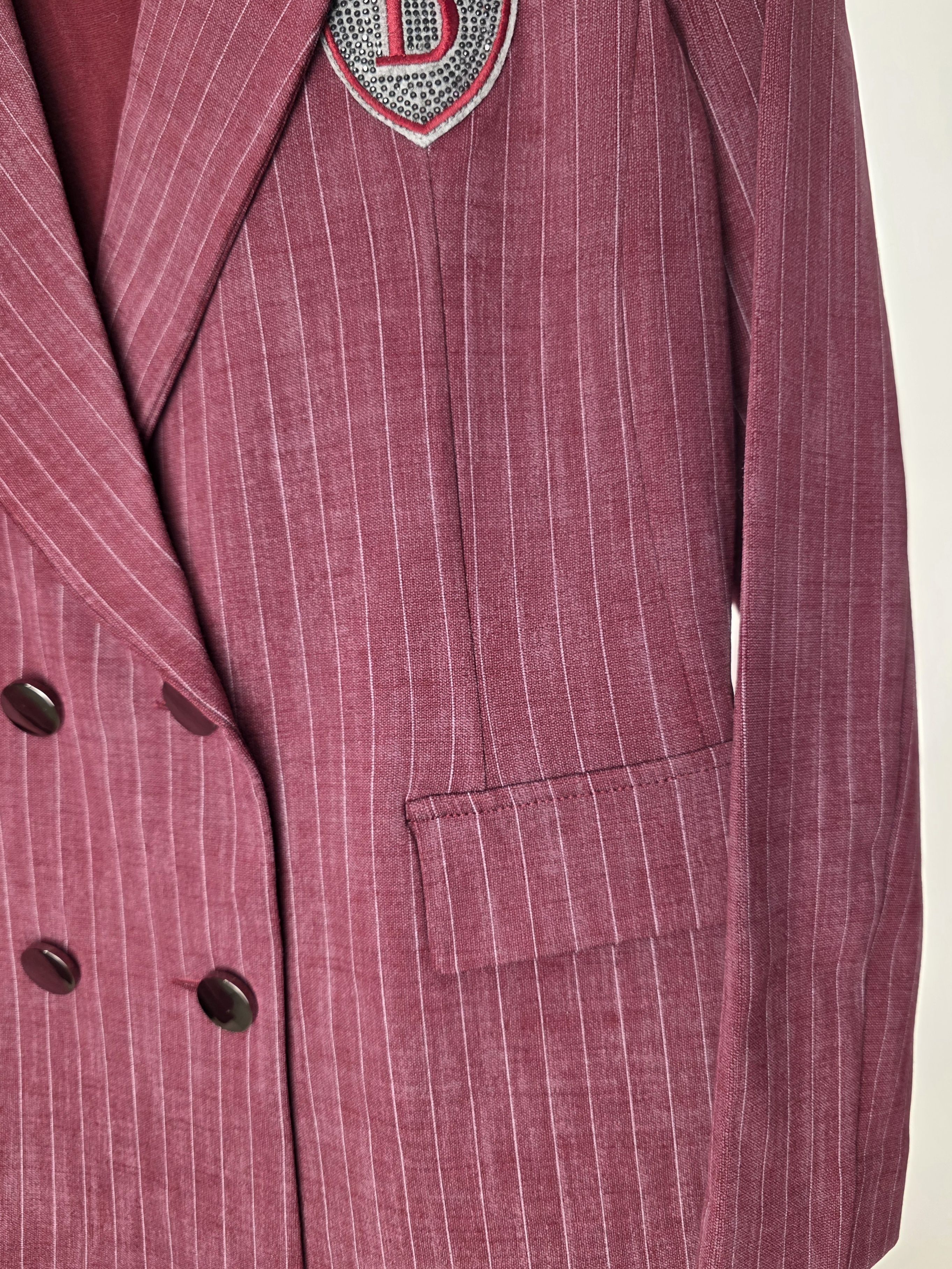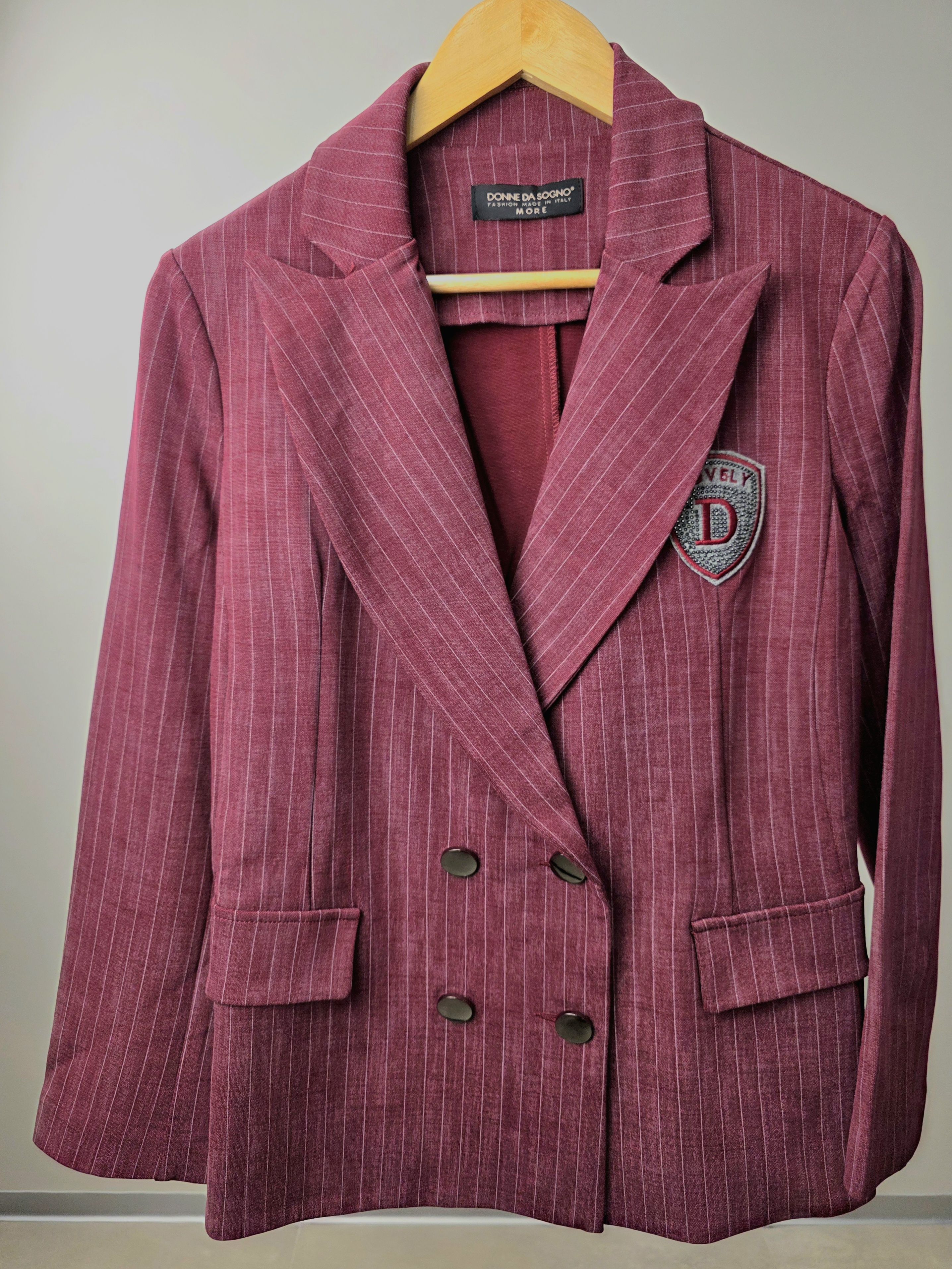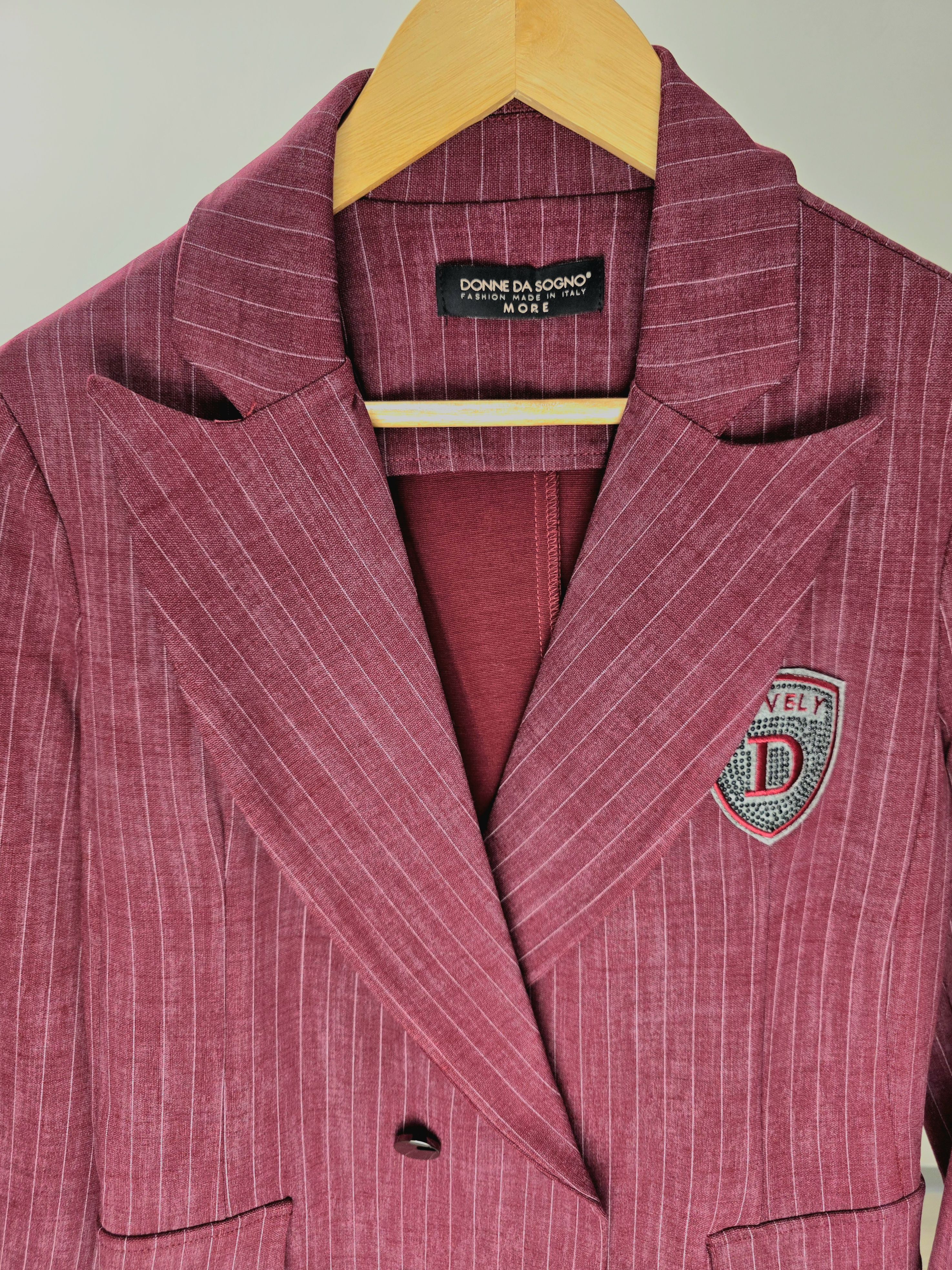 Женский двубортный трикотажный жакет в полоску с нашивкой со стразами на груди итальянского бренда Donne da Sogno.