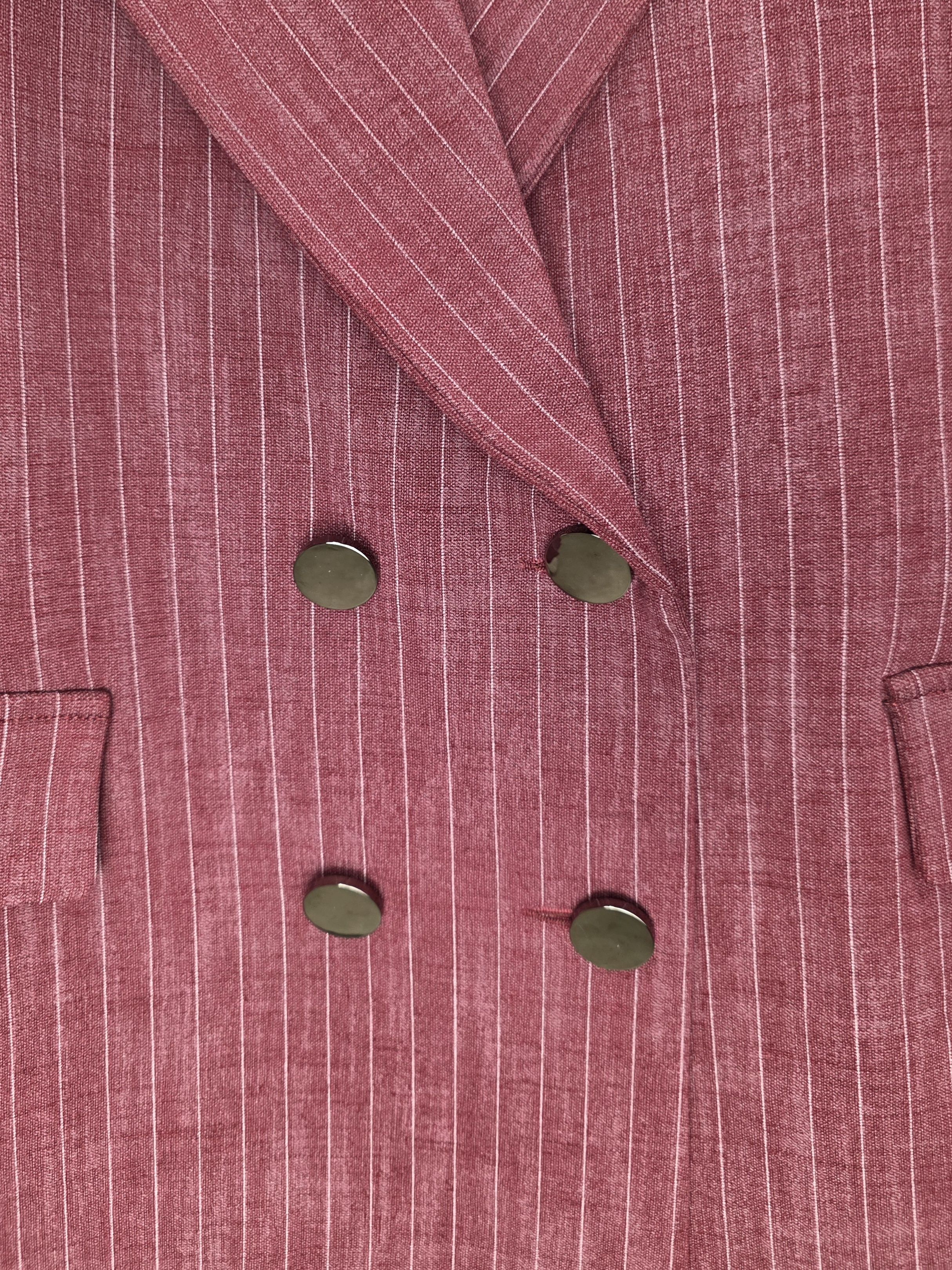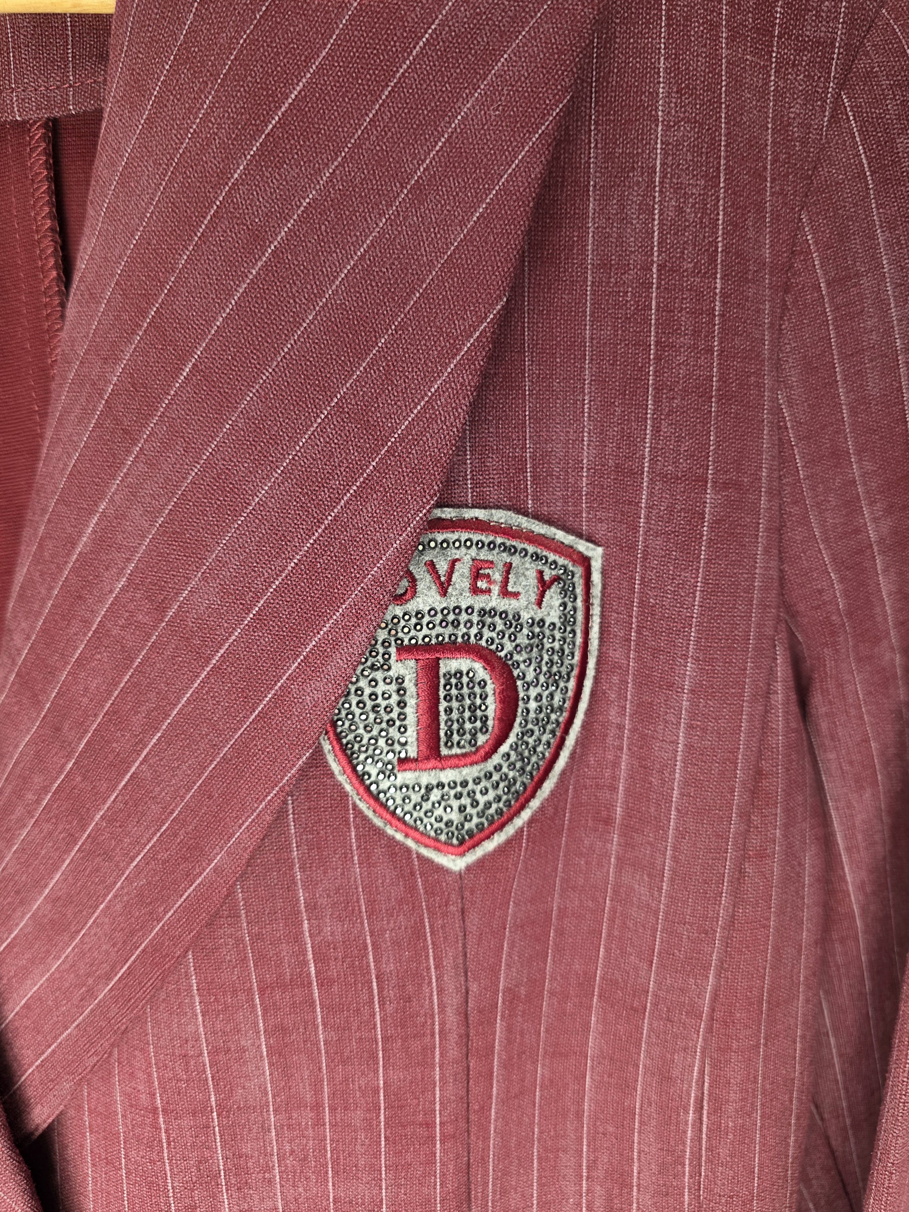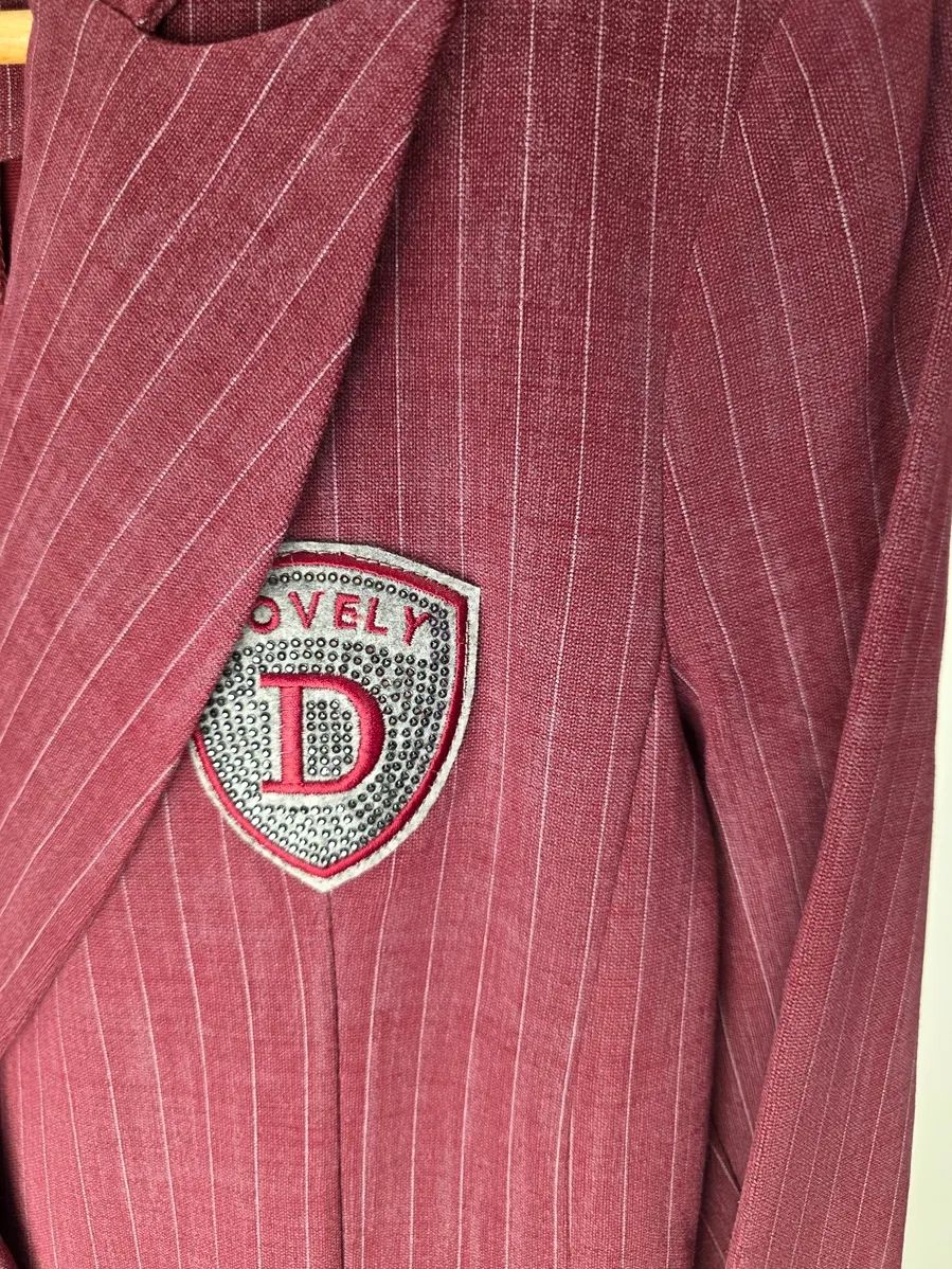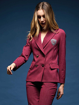 Женский двубортный трикотажный жакет в полоску с нашивкой со стразами на груди итальянского бренда Donne da Sogno.