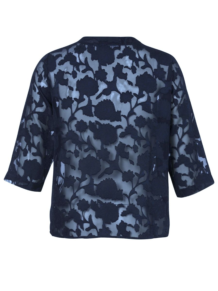 Поскольку жакет имеет слегка полупрозрачную структуру, под него лучше всего надевать однотонный топ.
