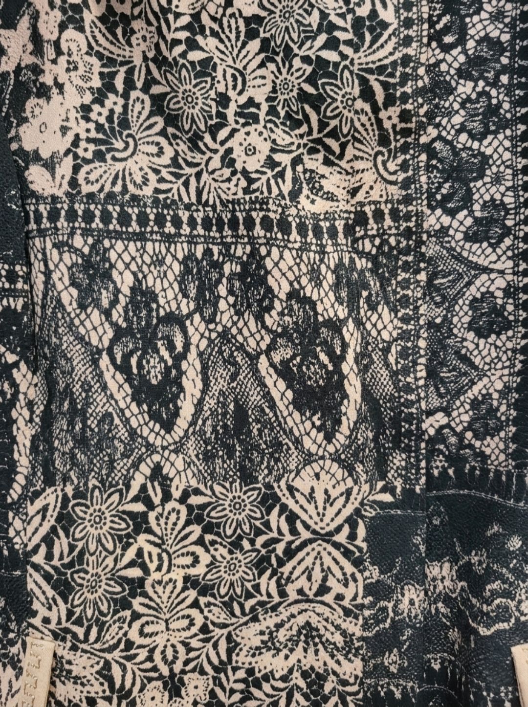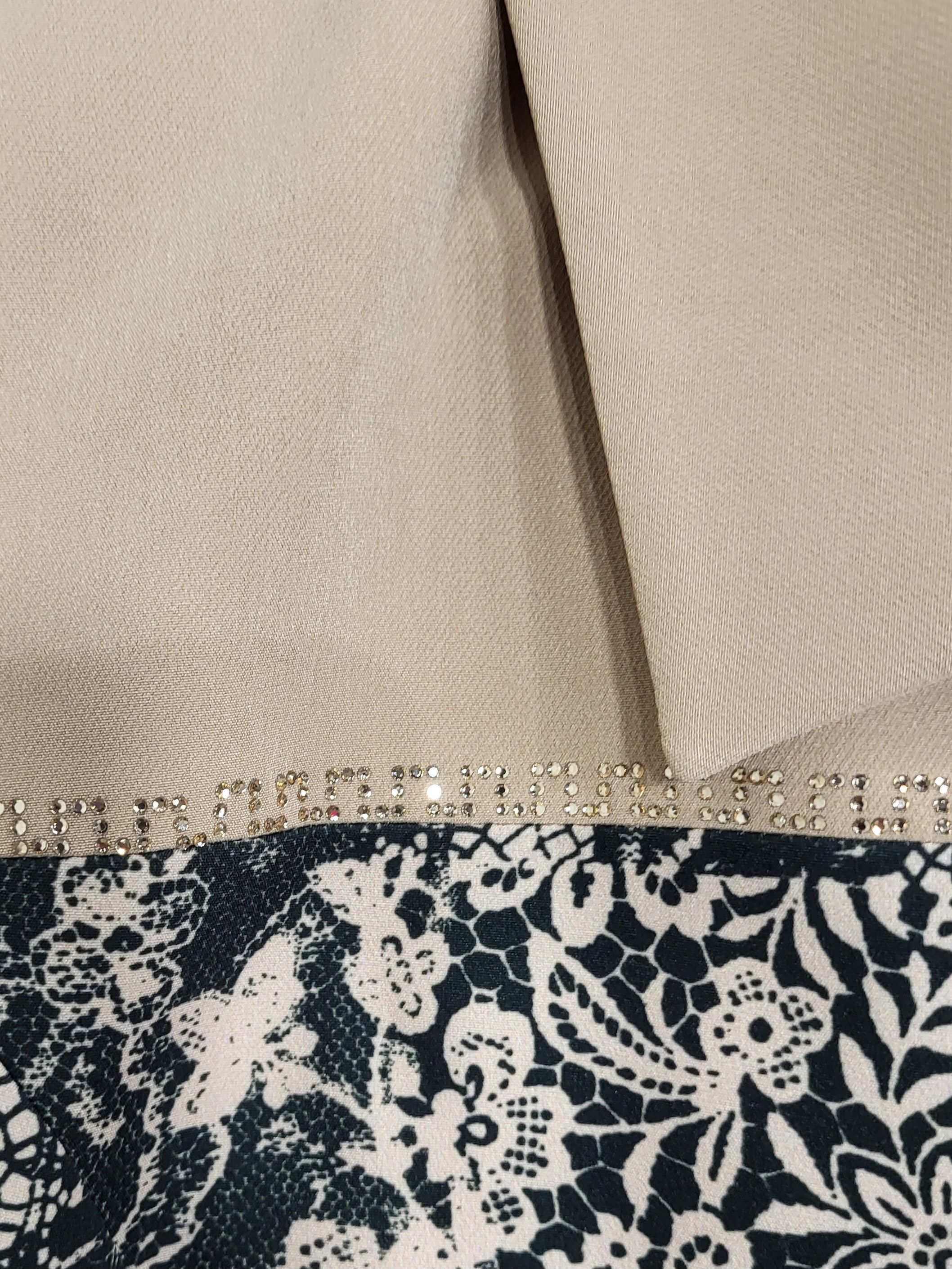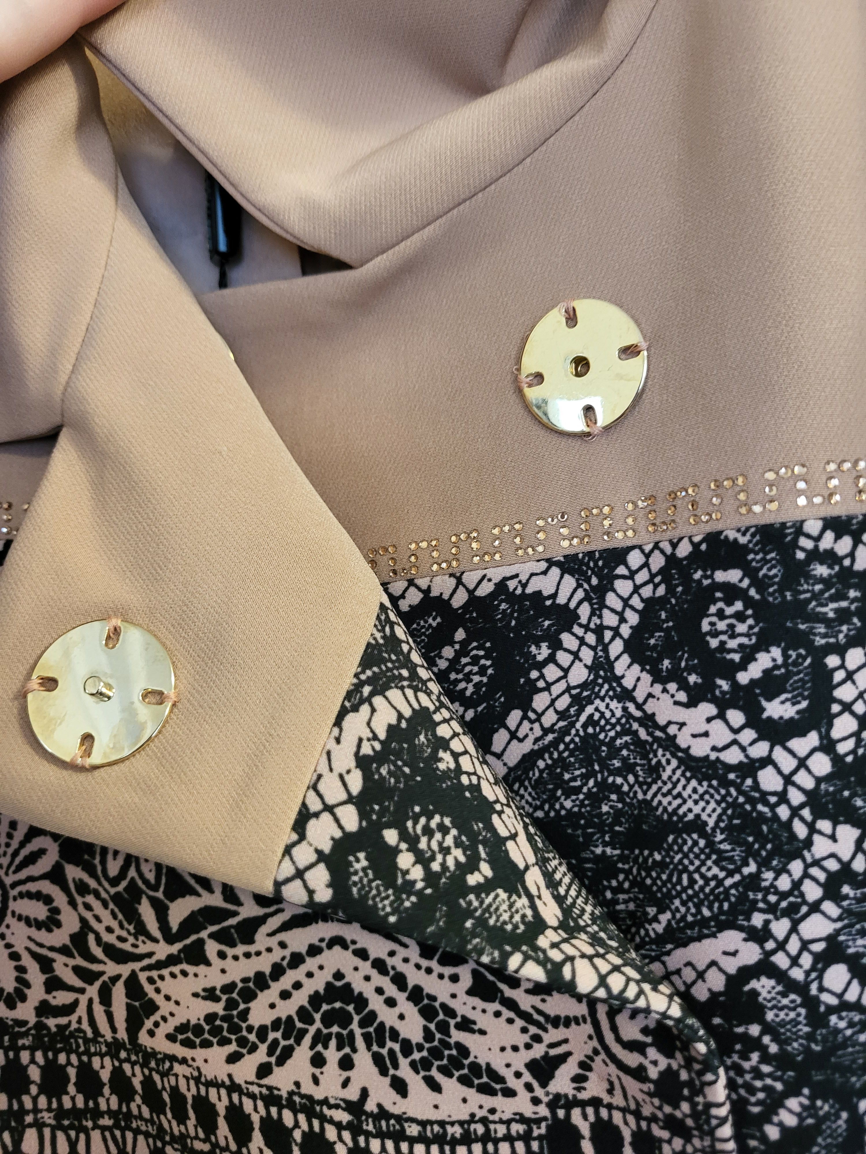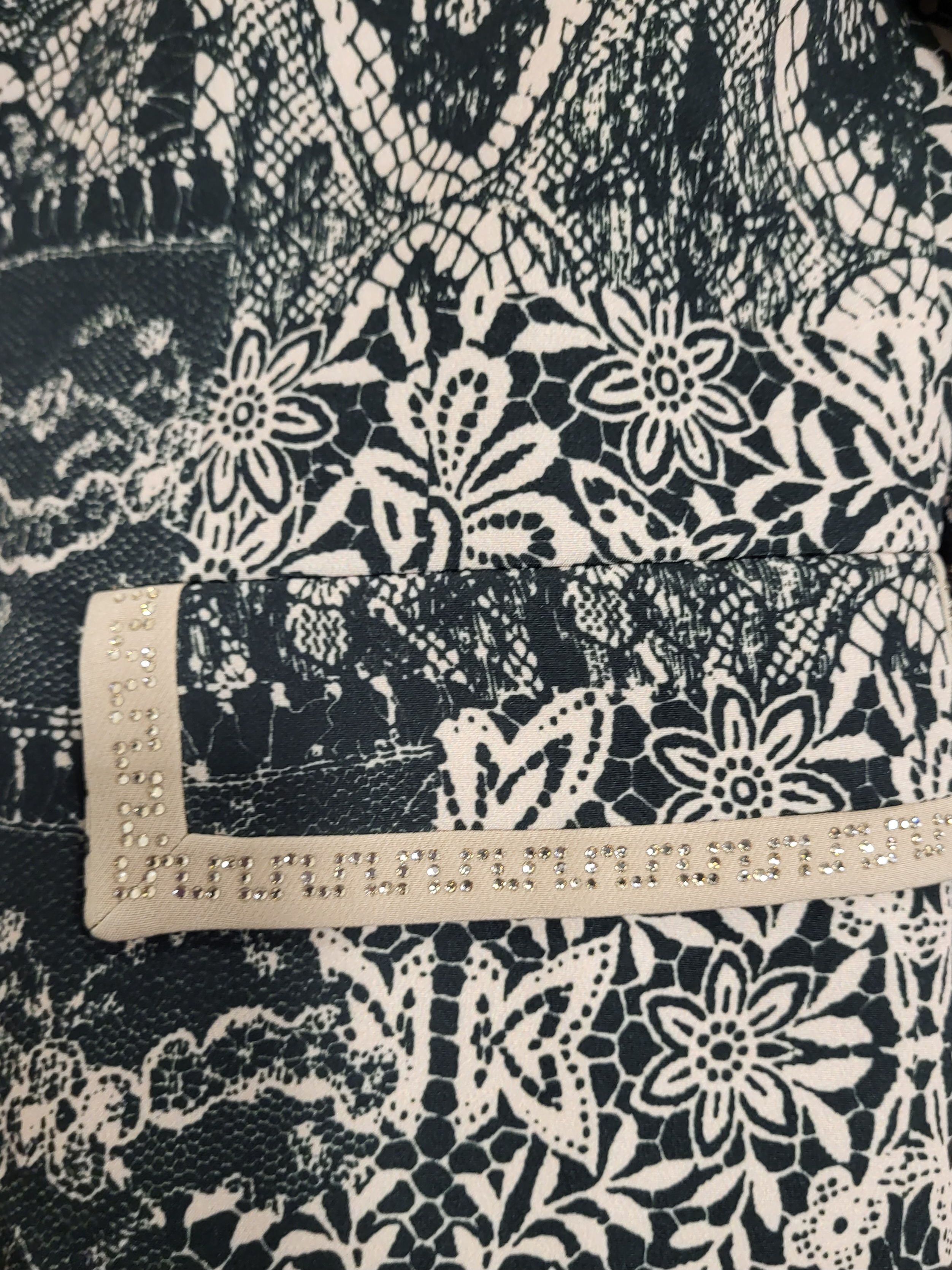 Двубортный жакет с принтом и стразами. Цвет: пудрово-розовый. Бренд: Elisa Fanti. Страна бренда: Италия. Страна производства: Италия. С юбкой sku 1385234331 получается комплект. Модель маломерит: размер 50 на 48-50 российский. Полуобхват груди 56см, полуобхват талии 50см, полуобхват бёдер 58см, длина 65см, длина рукава 60см. Детали: Застёжки-кнопки на передней части изделия в 2 ряда по всей длине. Отложной воротник. Карманы. Состав: 97% полиэстер, 3% эластан. Подкладка: 68% ацетат, 32% полиэстер. Уход: Стирка запрещена. Не отбеливать. Не сушить в сушильной машине. Гладить на минимальном температурном режиме наизнанку. Разрешена только щадящая чистка.