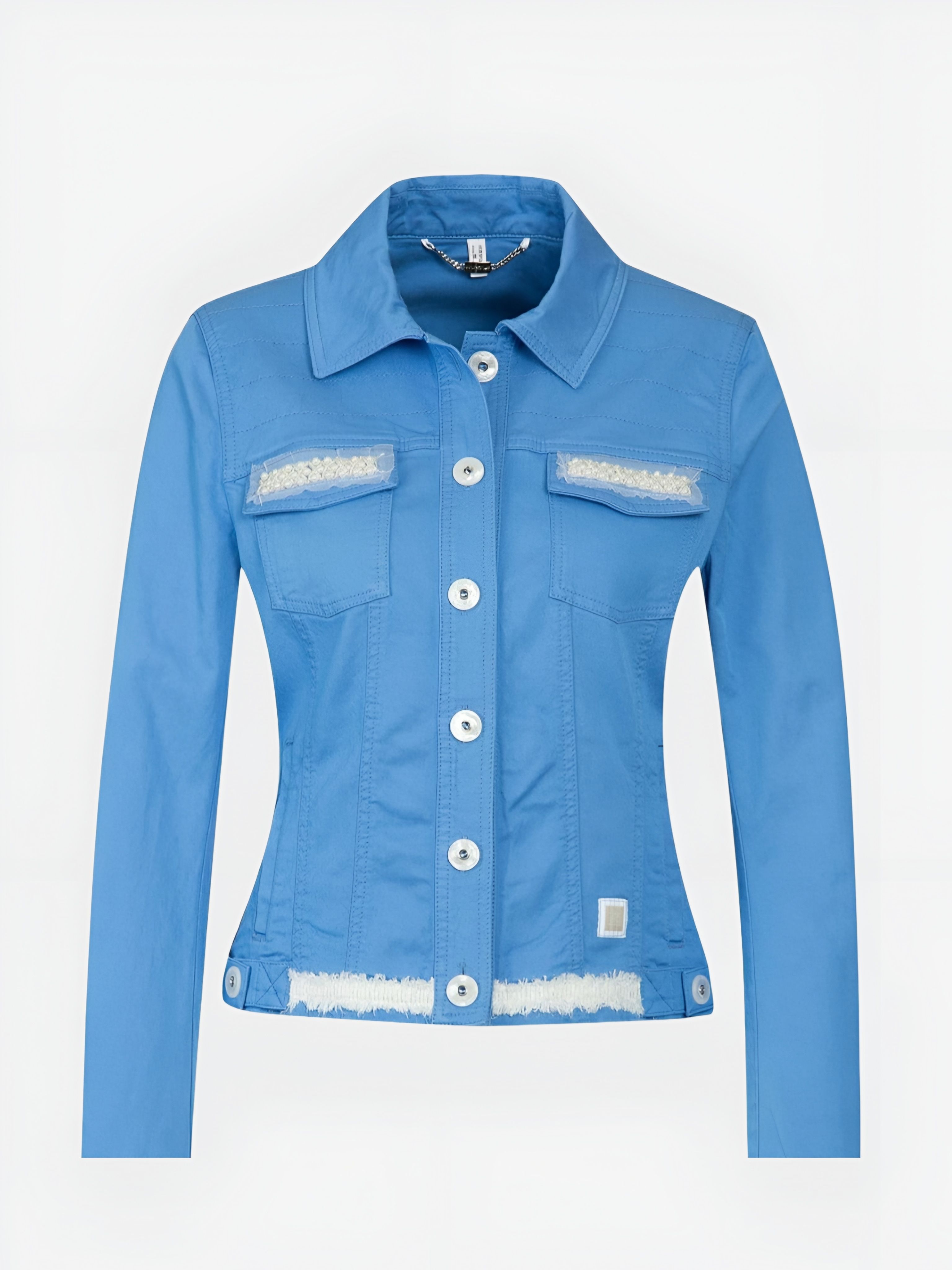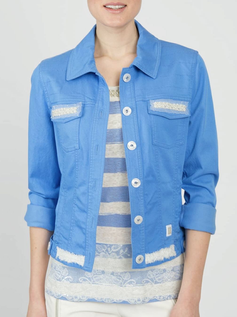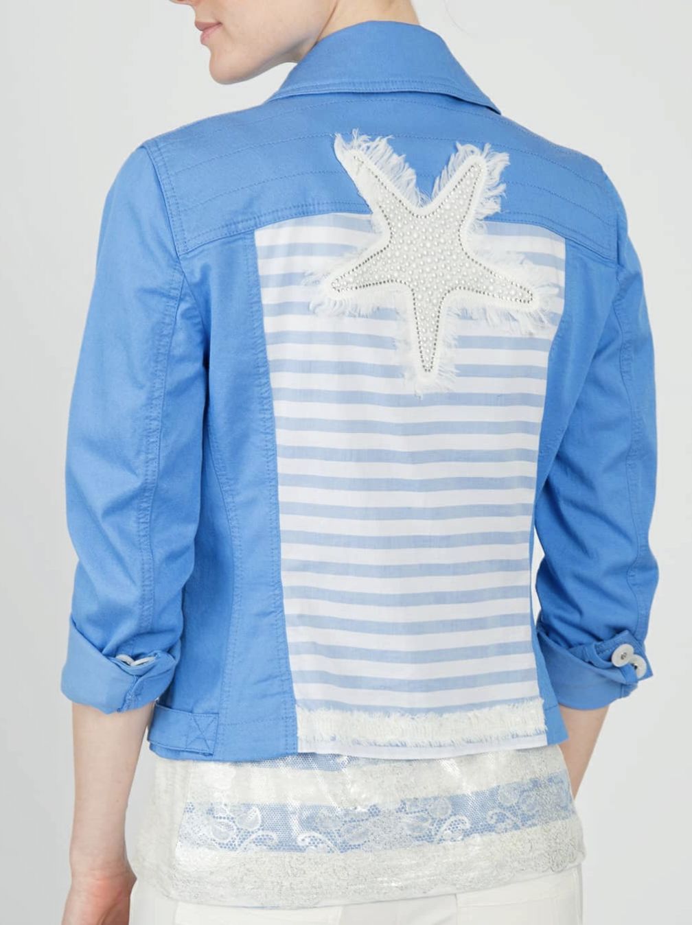 Жакет женский ярко-голубого цвета с полосами на спине и аппликацией в виде морской звезды из страз под "жемчуг" австрийского бренда Sportalm.