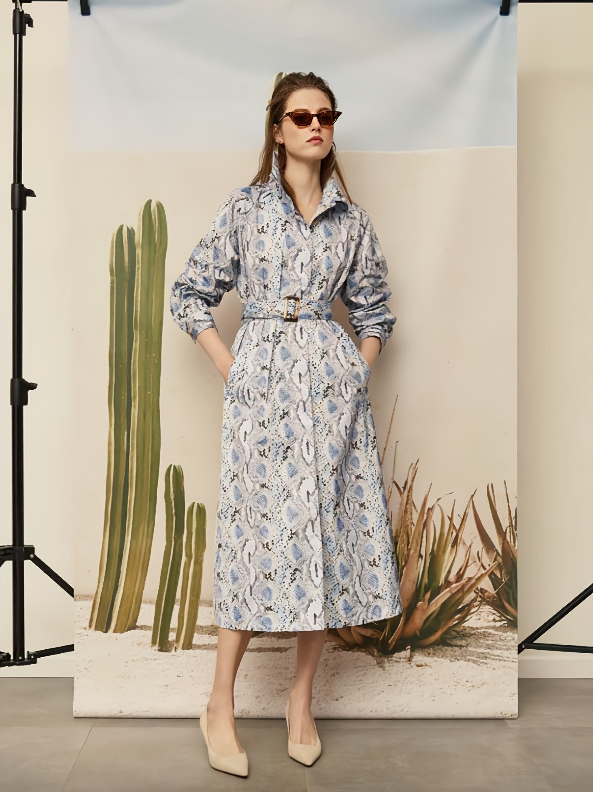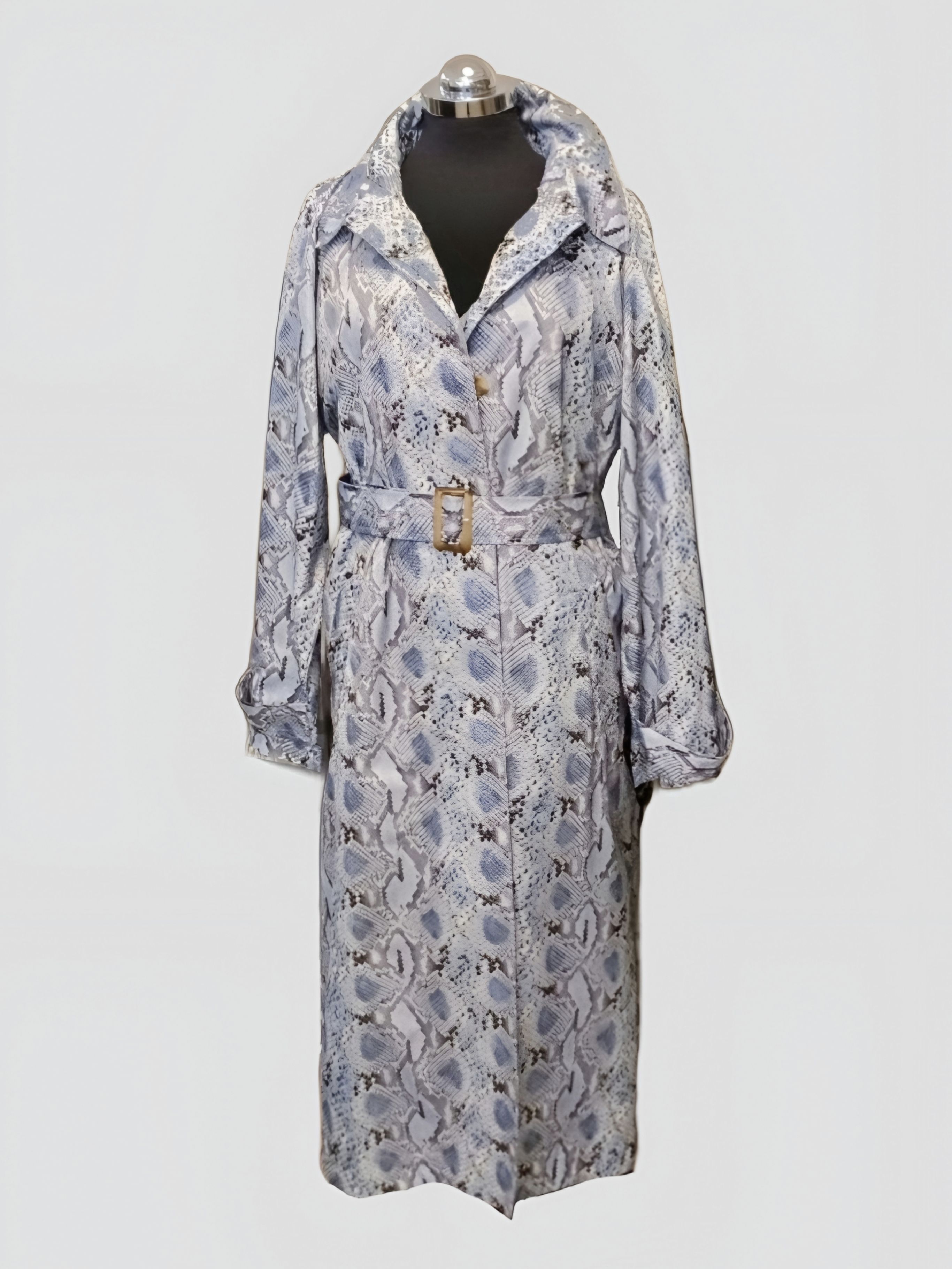 Плащ длиной до середины икры, с поясом для застёгивания, длинными рукавами, стандартным воротником, прямой посадкой и более широкой посадкой в нижней части.