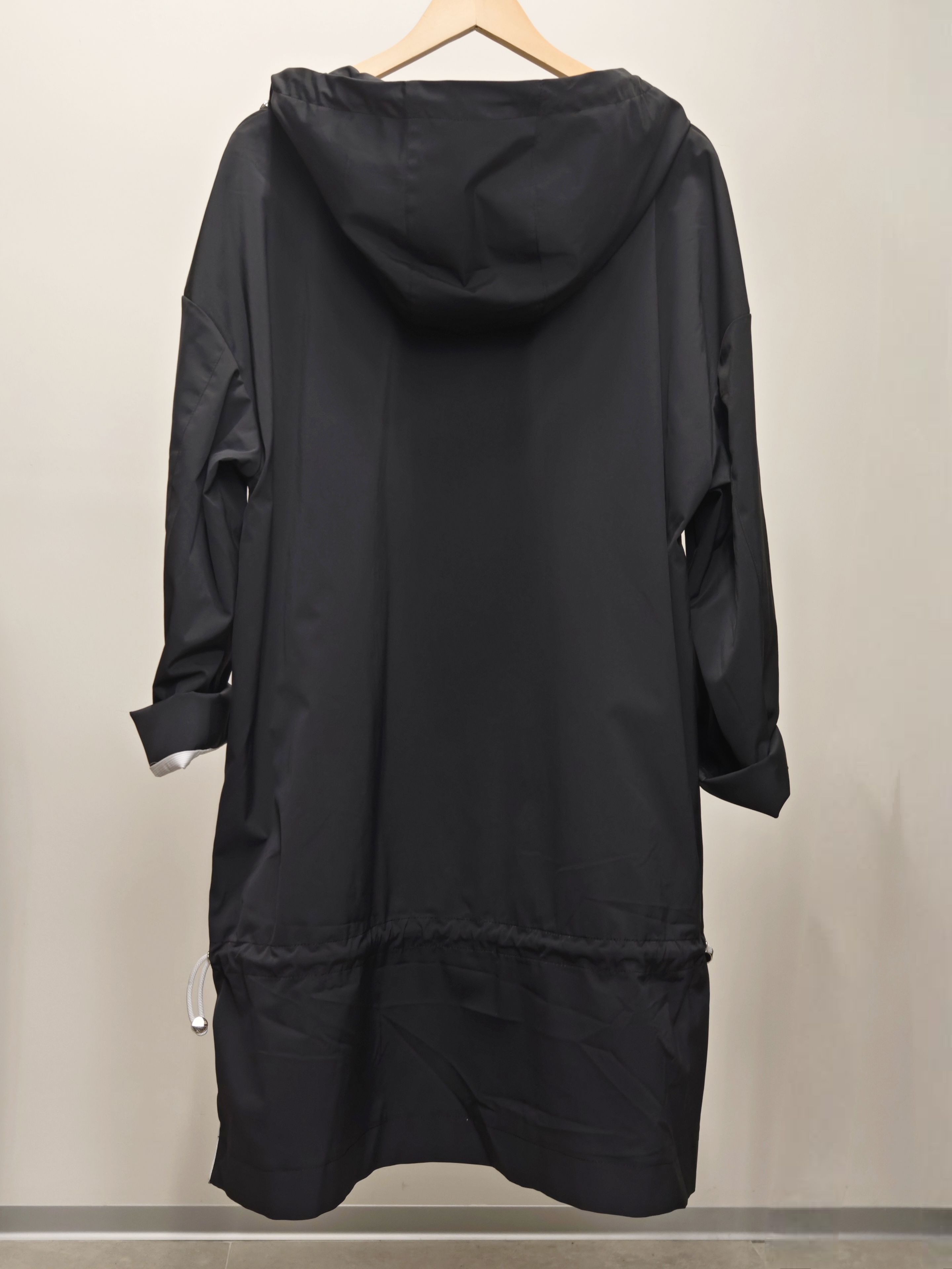 Плащ длиной до колена, длинными рукавами, капюшоном, прямой посадкой и более широкой посадкой в нижней части.