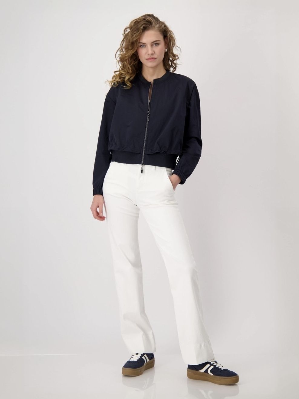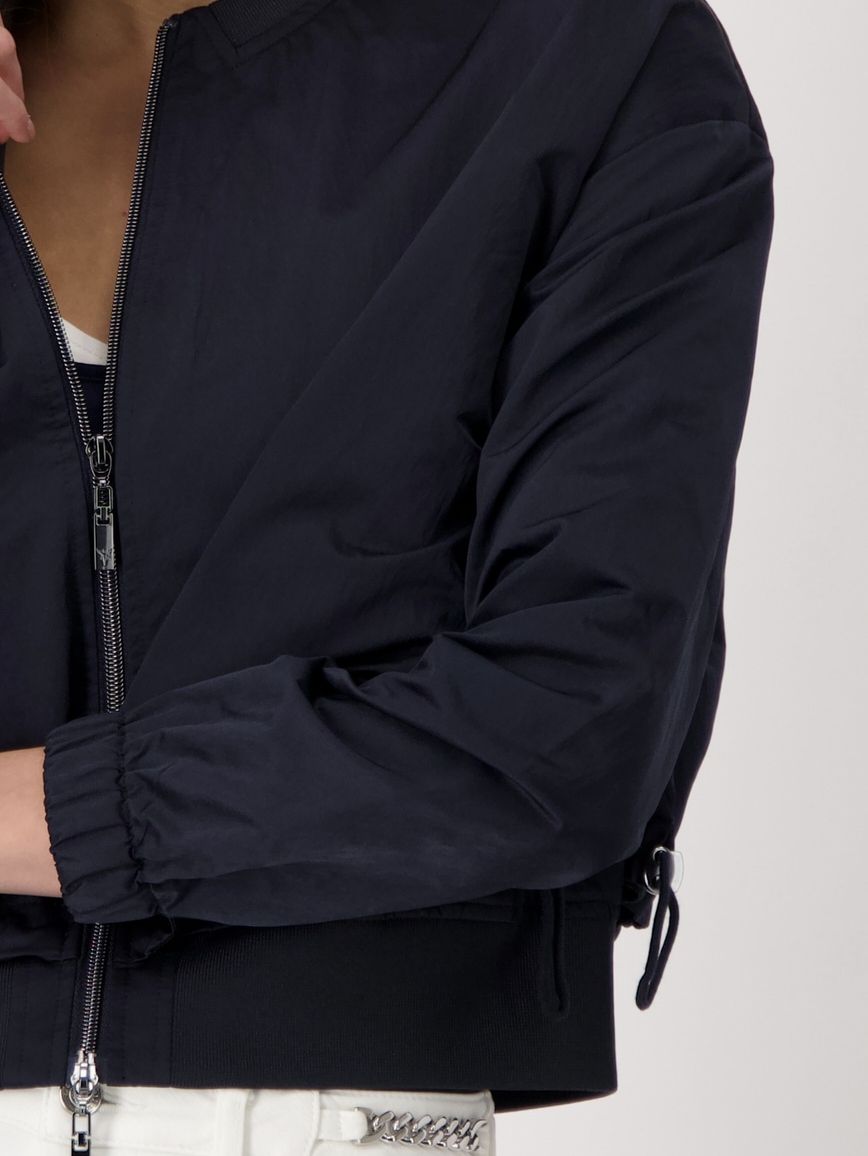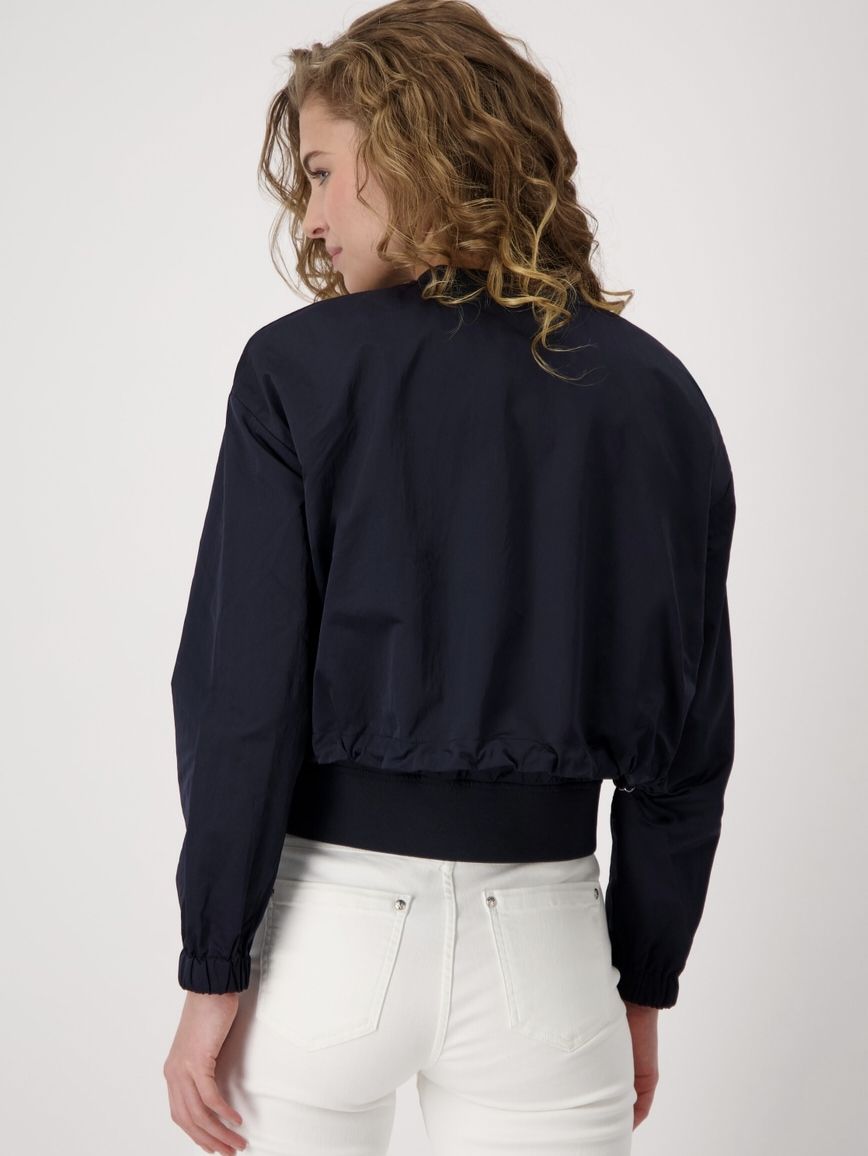 Эта женская куртка-ветровка из прочной нейлоновой ткани из коллекции весна-лето 2025 немецкого бренда Monari впечатляет эластичным краем рукавов, потайными боковыми карманами и двойным краем.