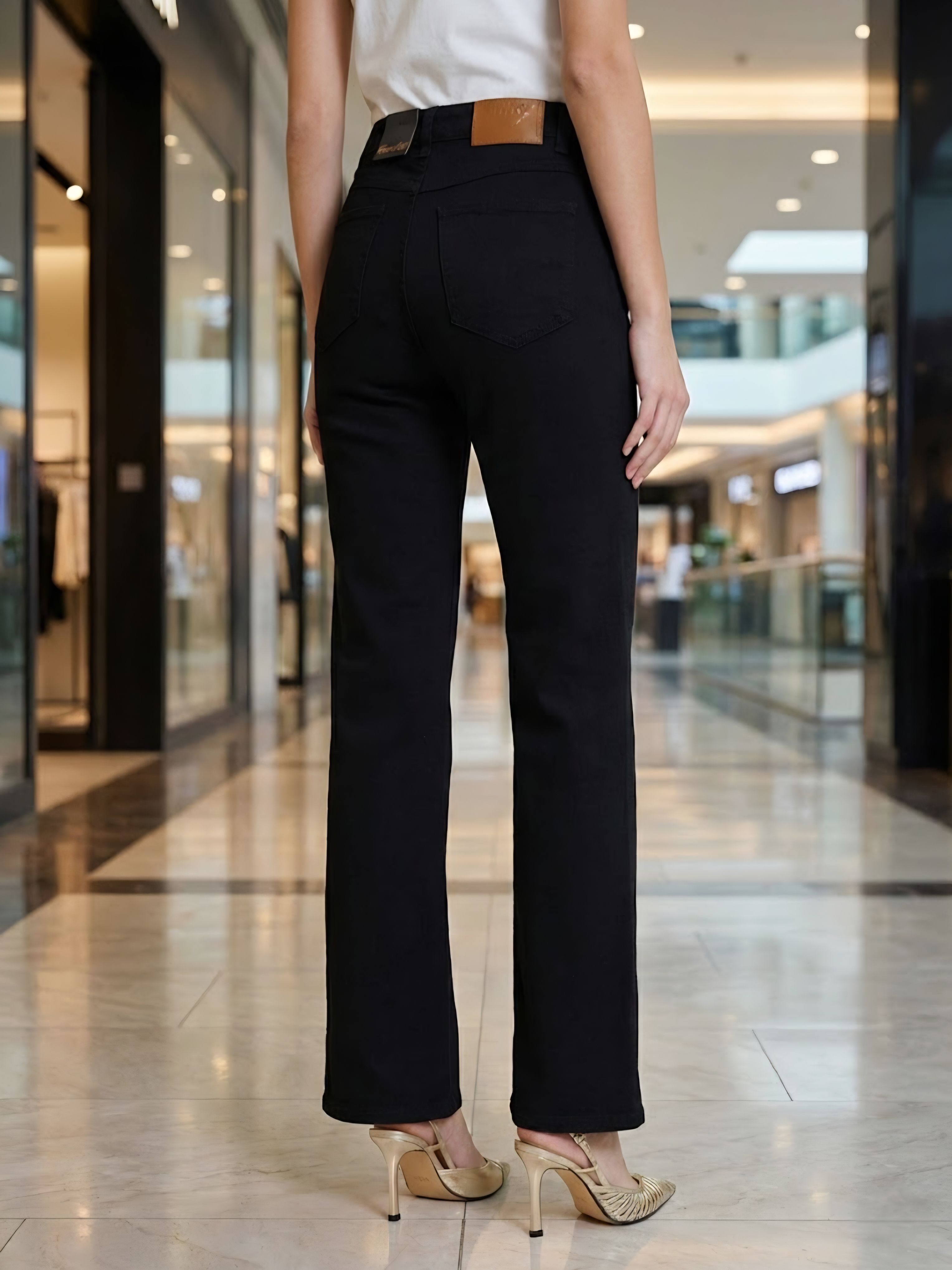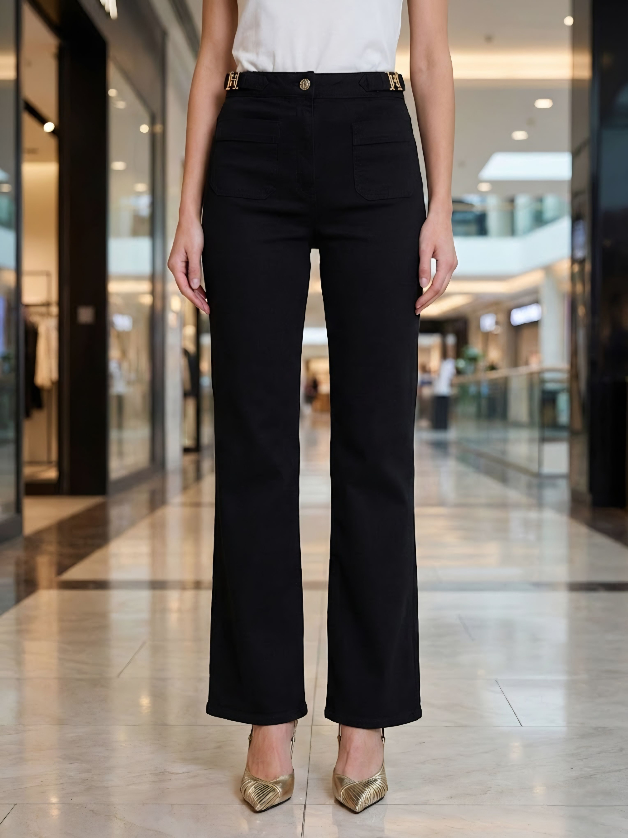 Джинсовые женские брюки (джинсы) прямого кроя из плотной хлопковой ткани с эластаном матового чёрного цвета и декоративными золотистыми пряжками на поясе итальянского бренда Franco Vello.