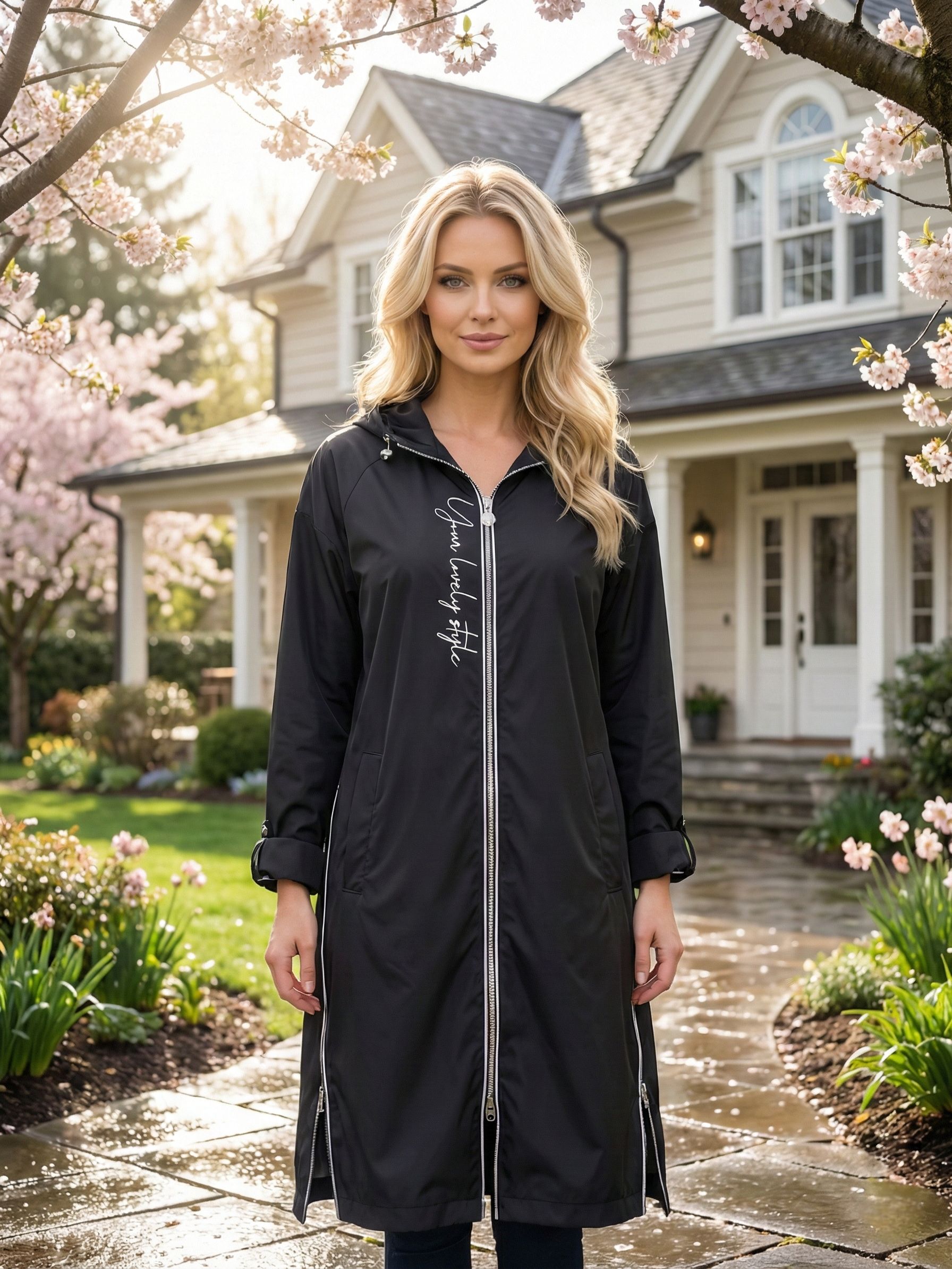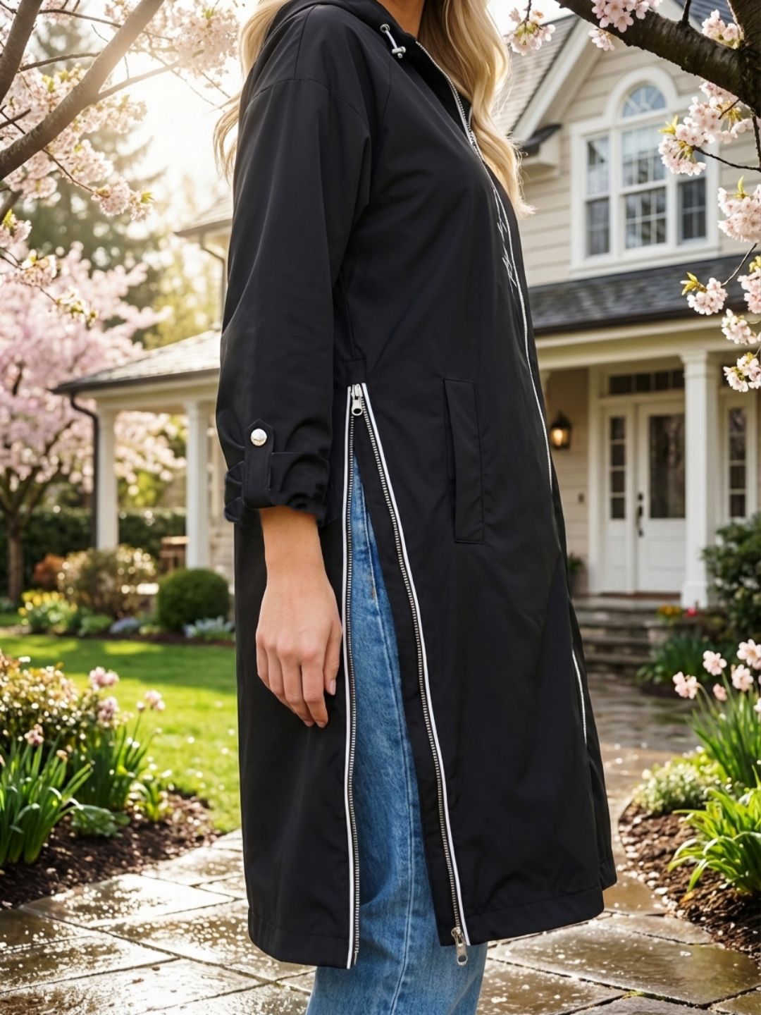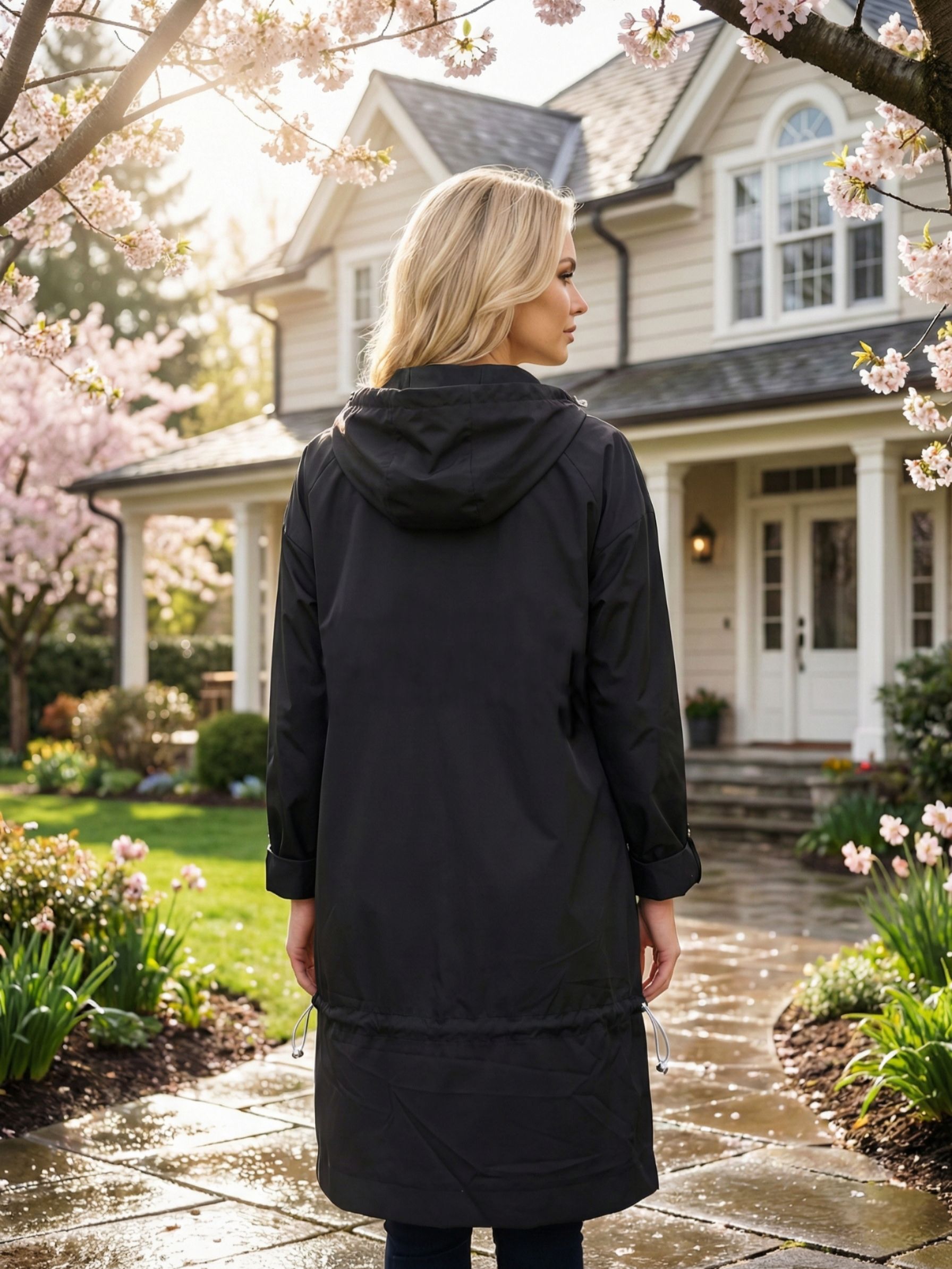 Плащ длиной до колена, длинными рукавами, капюшоном, прямой посадкой и более широкой посадкой в нижней части.